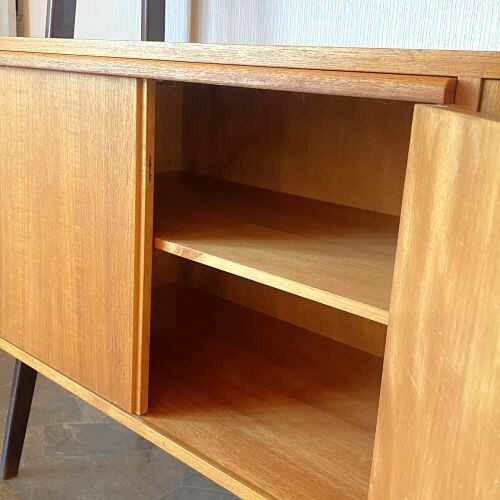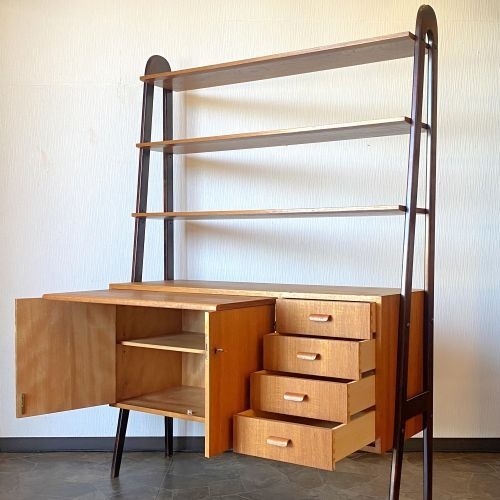 スライド式の天板付きです。その下には開き戸の収納があり、取り外しのできるカギが付いていて、持ち手になります。小物が収納できる引き出しが4段あります。