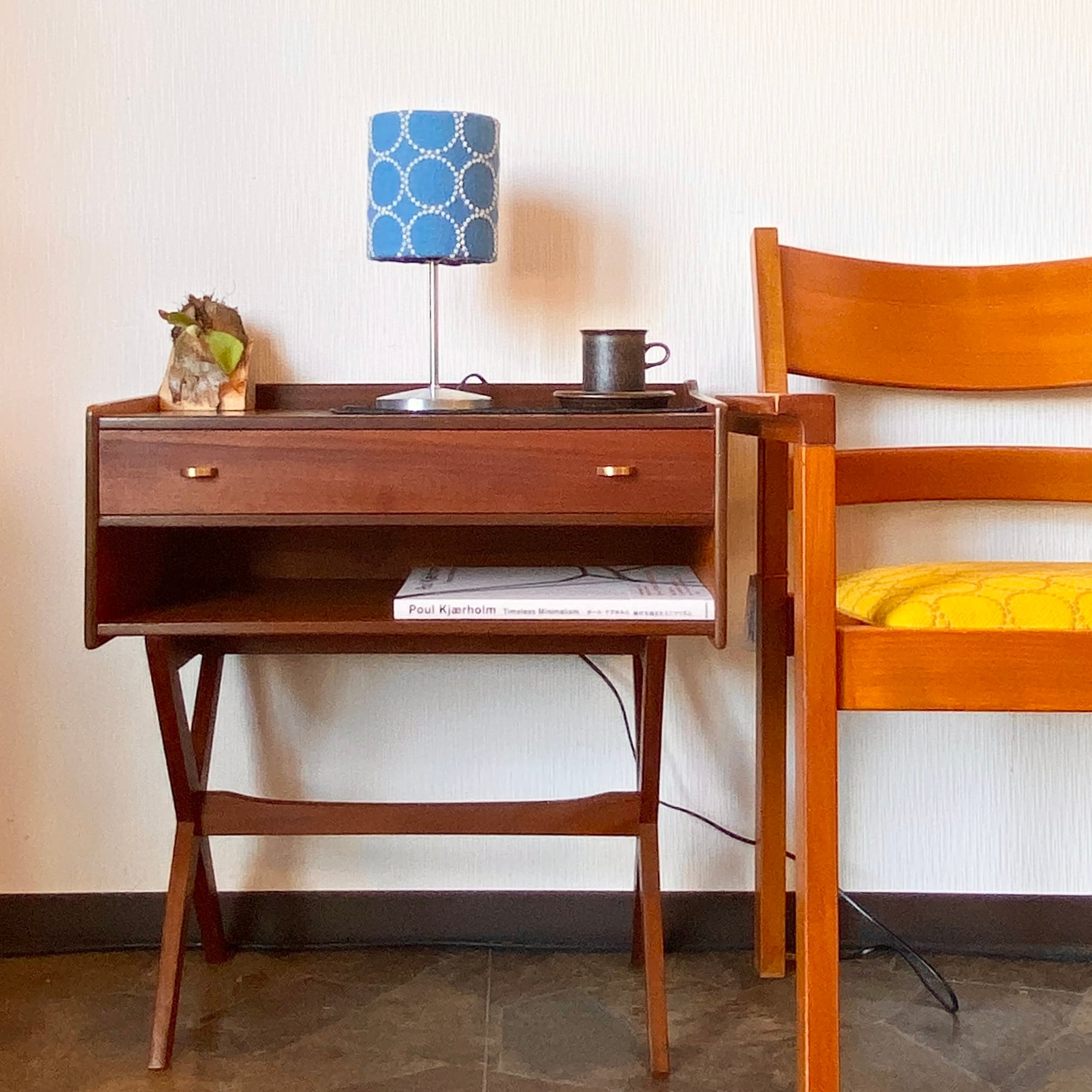アームチェアのアーム高と同じほどの高さは、サイドテーブル代わりとして使いやすいものです。