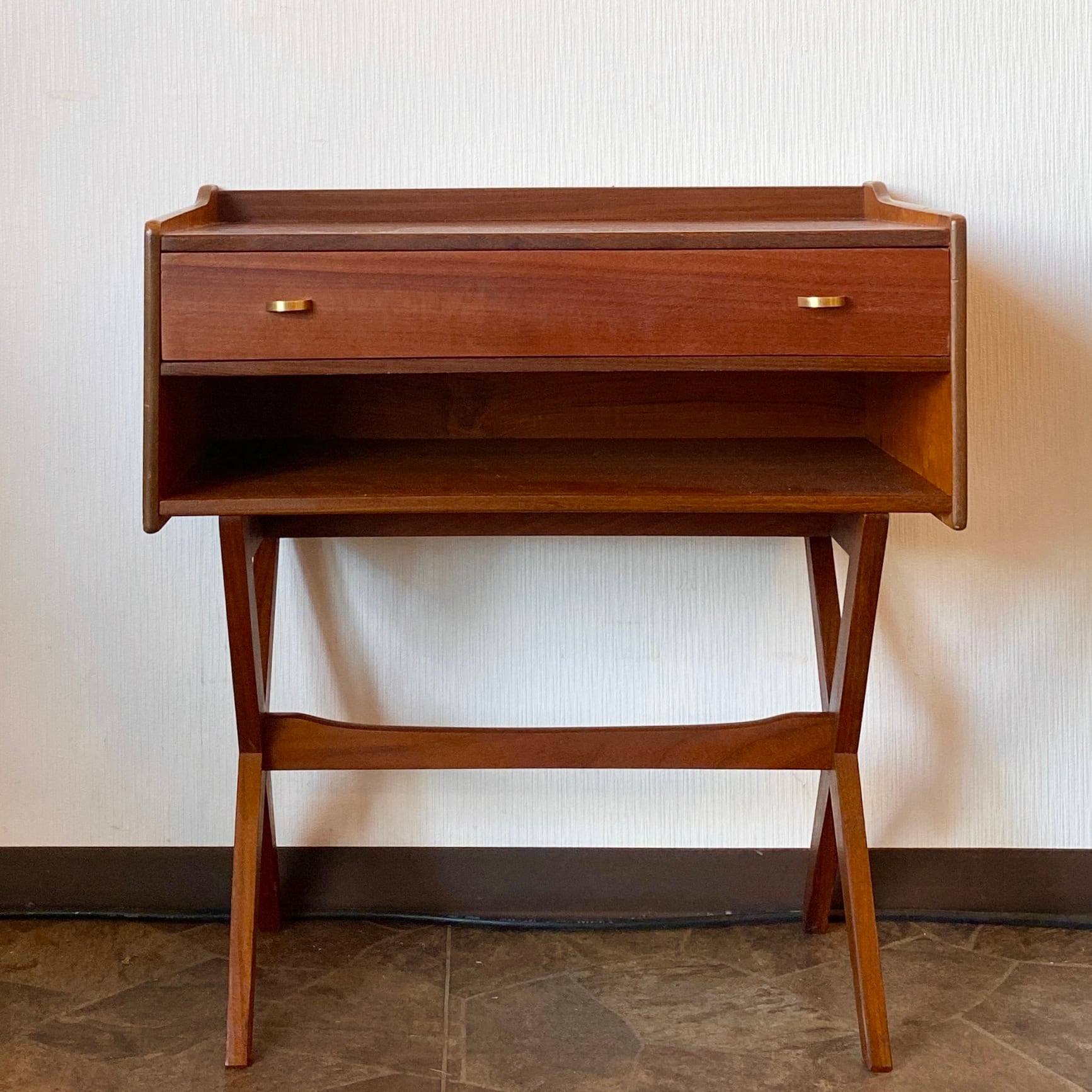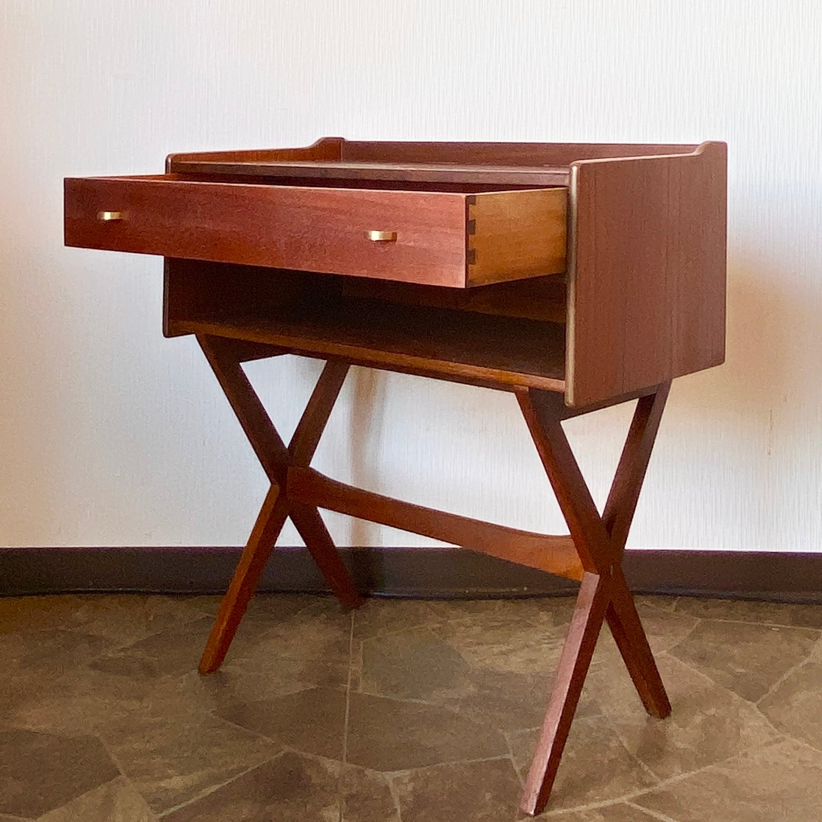 薄い木材のフレーム、強度のあるクロスした脚部、真鍮の持ち手、引き出しとオープンという収納の組み合わせ。