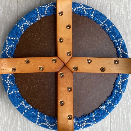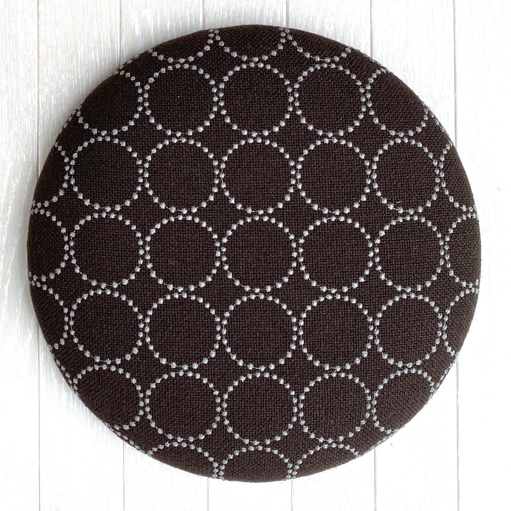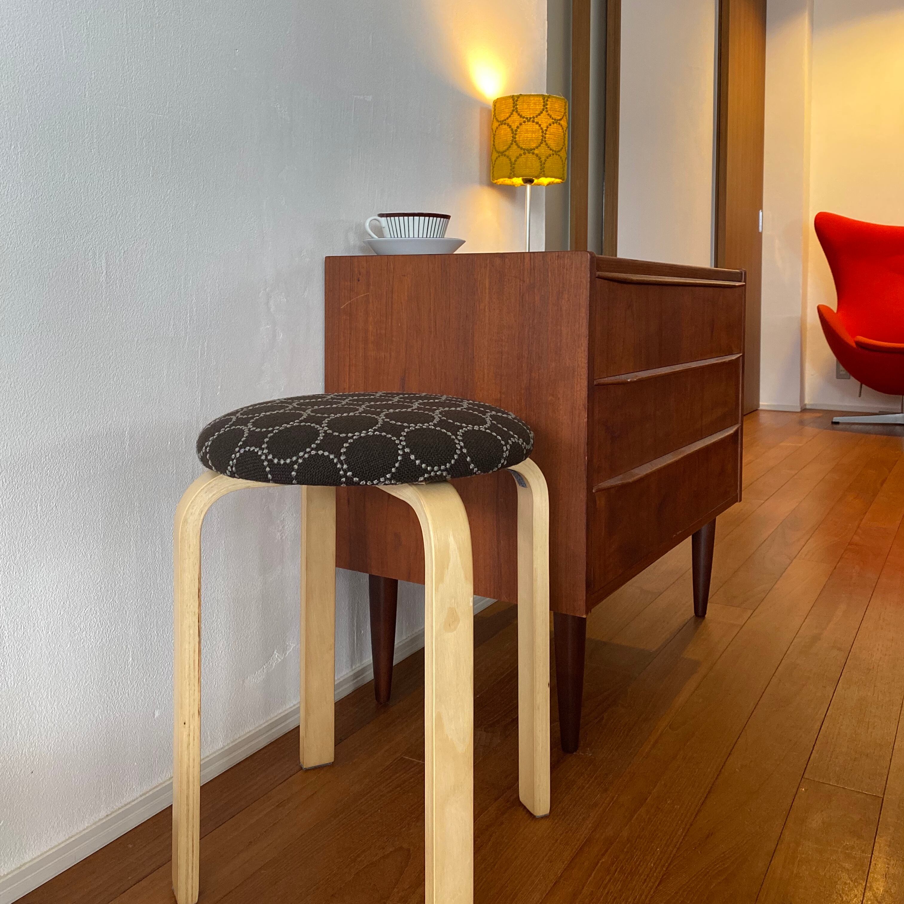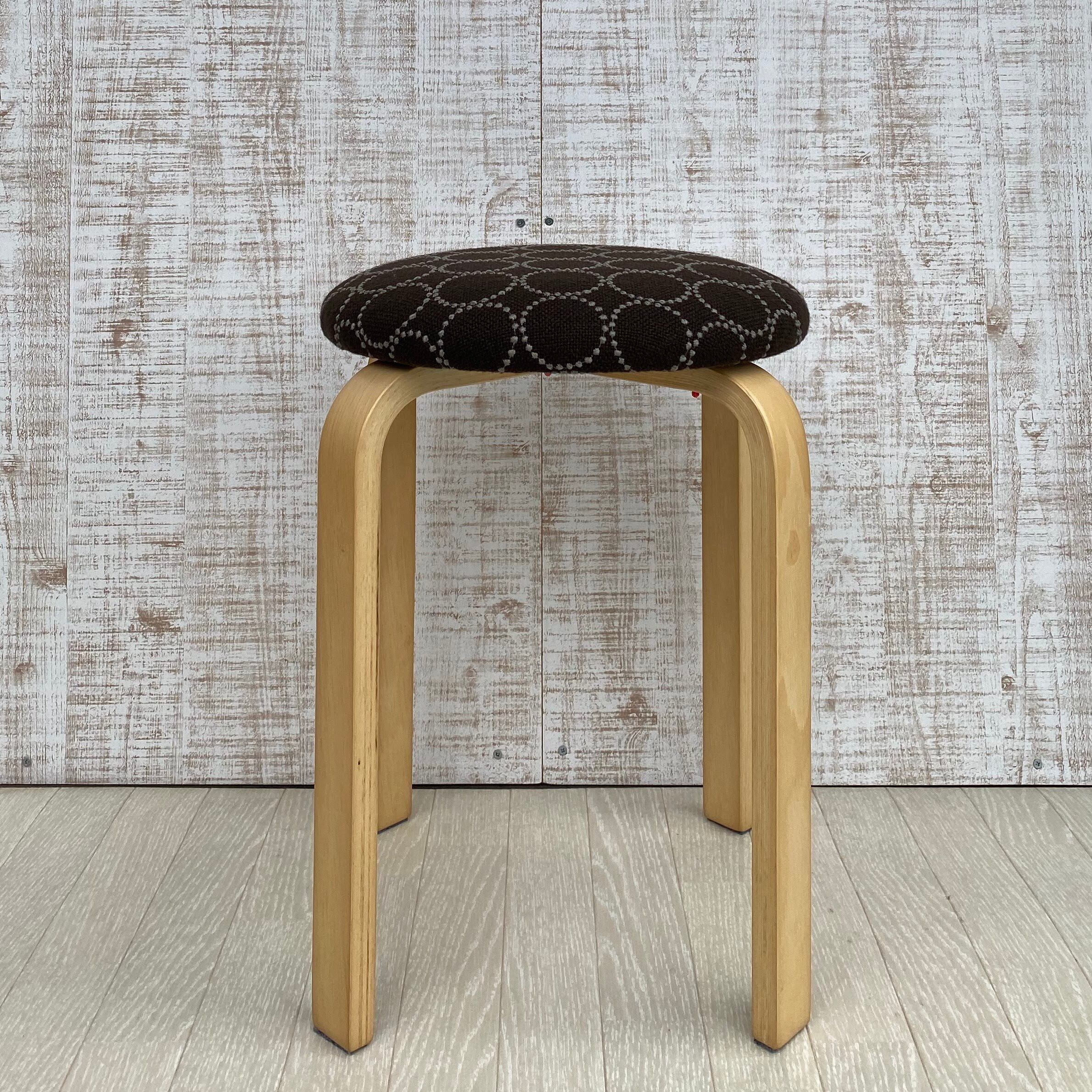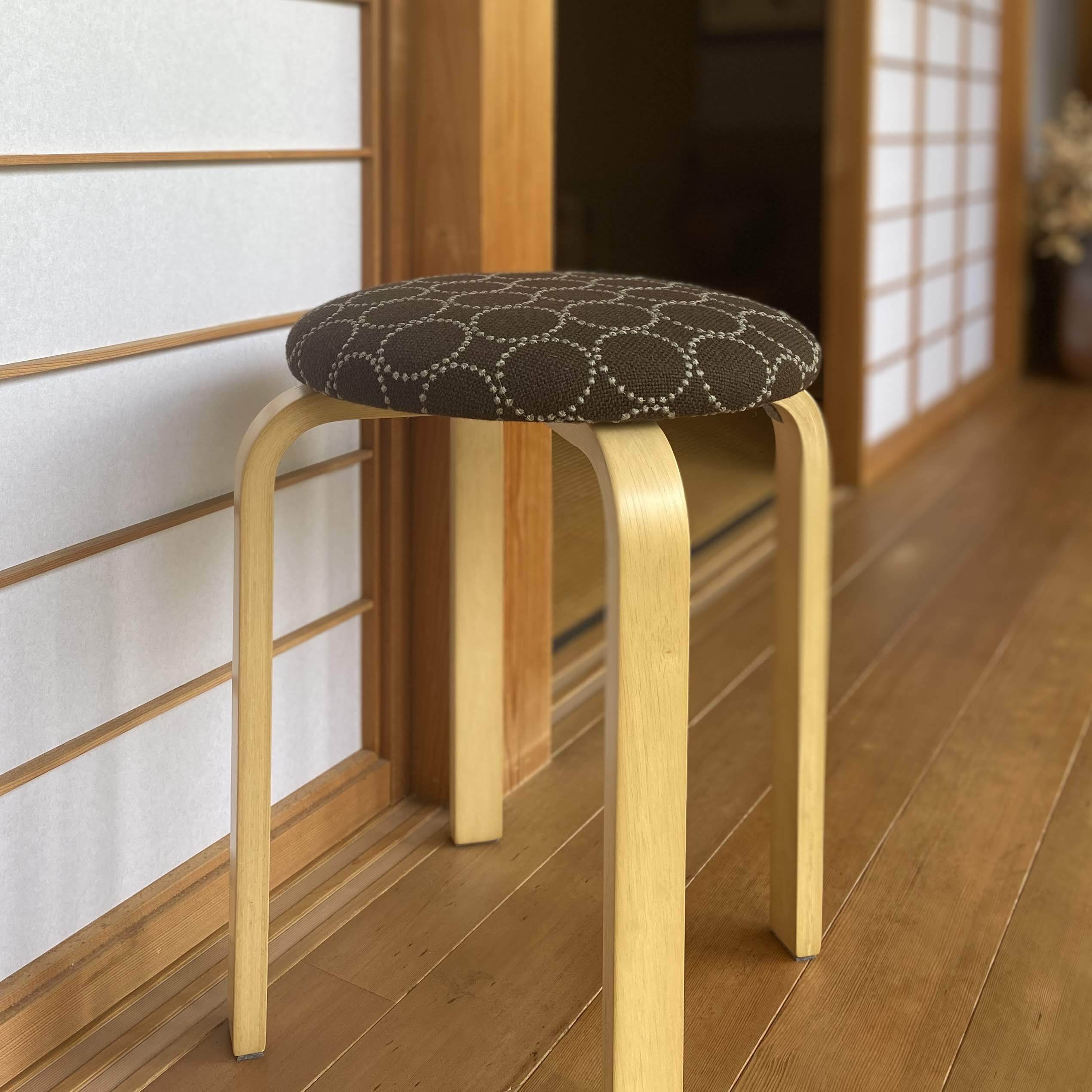 皆川明氏とデンマーク・クヴァドラ社のコラボによる生地、タンバリンハリンダルを使用したスツールです。
