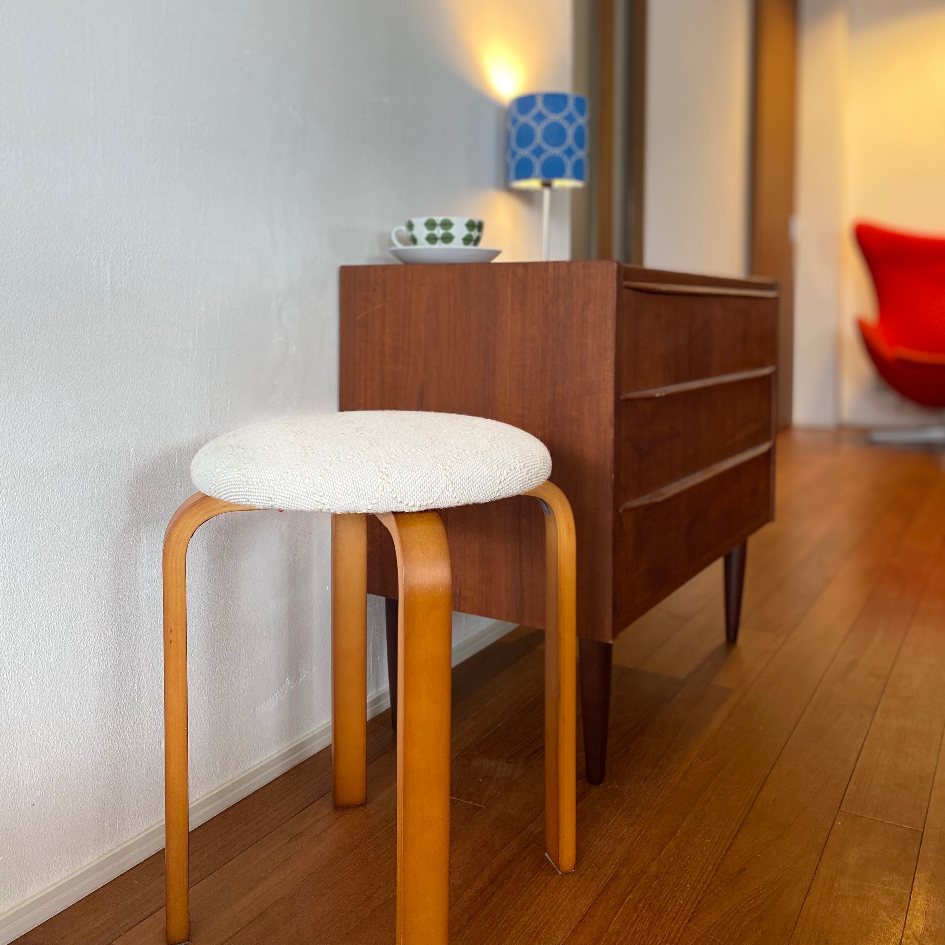 皆川明氏とデンマーク・クヴァドラ社のコラボによる生地、タンバリンハリンダルを使用したスツールです。
