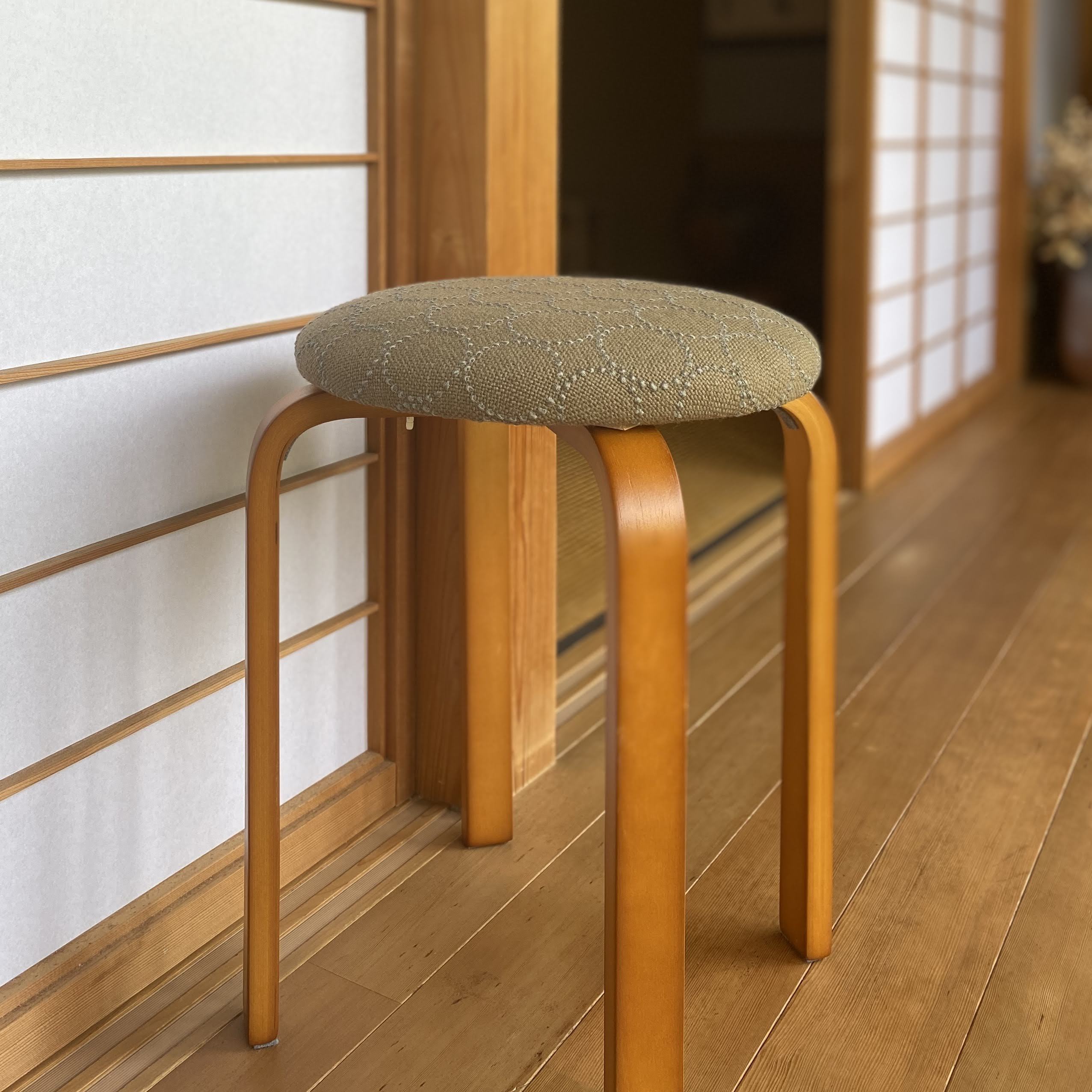 皆川明氏とデンマーク・クヴァドラ社のコラボによる生地、タンバリンハリンダルを使用したスツールです。