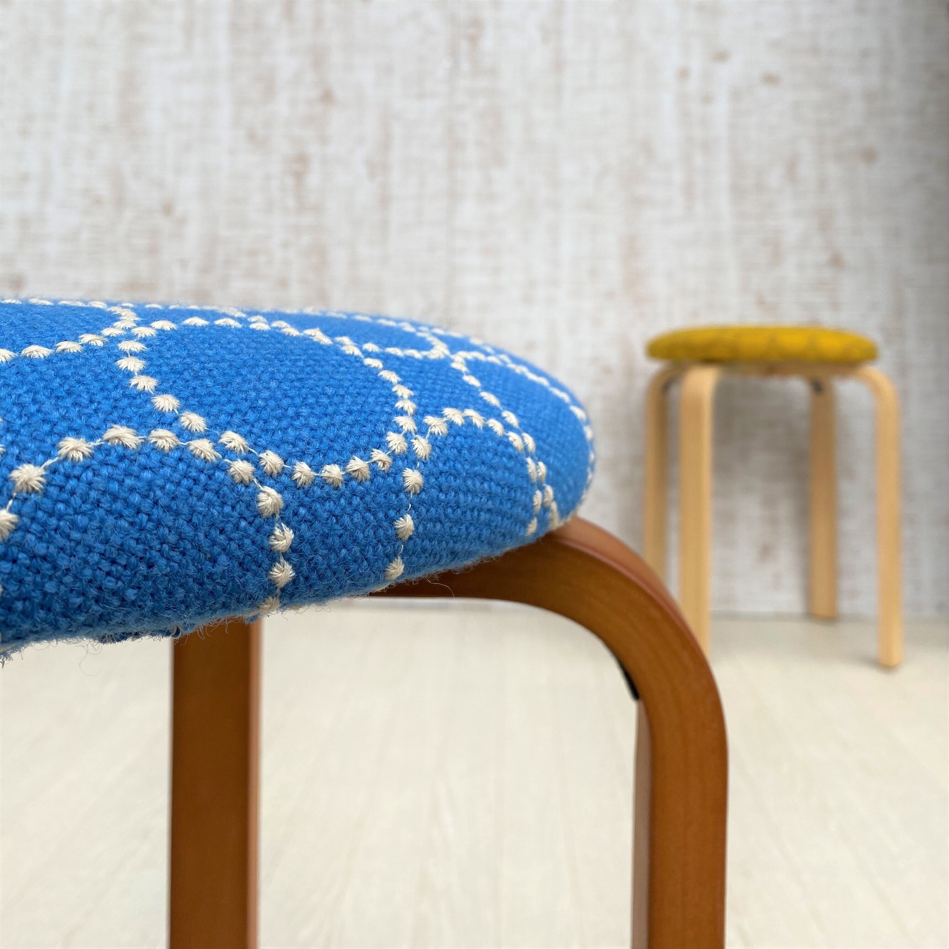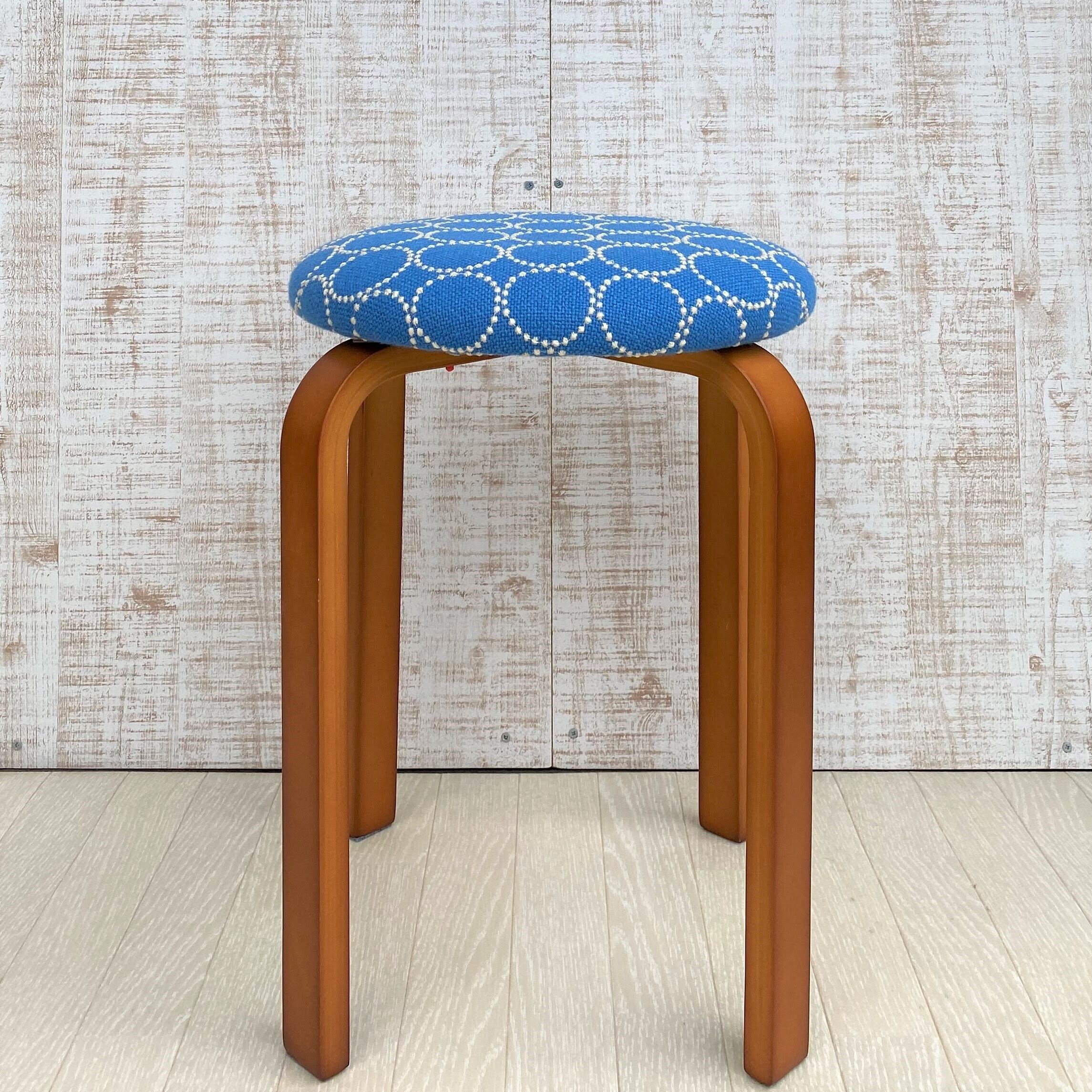 皆川明氏とデンマーク・クヴァドラ社のコラボによる生地、タンバリンハリンダルを使用したスツールです。