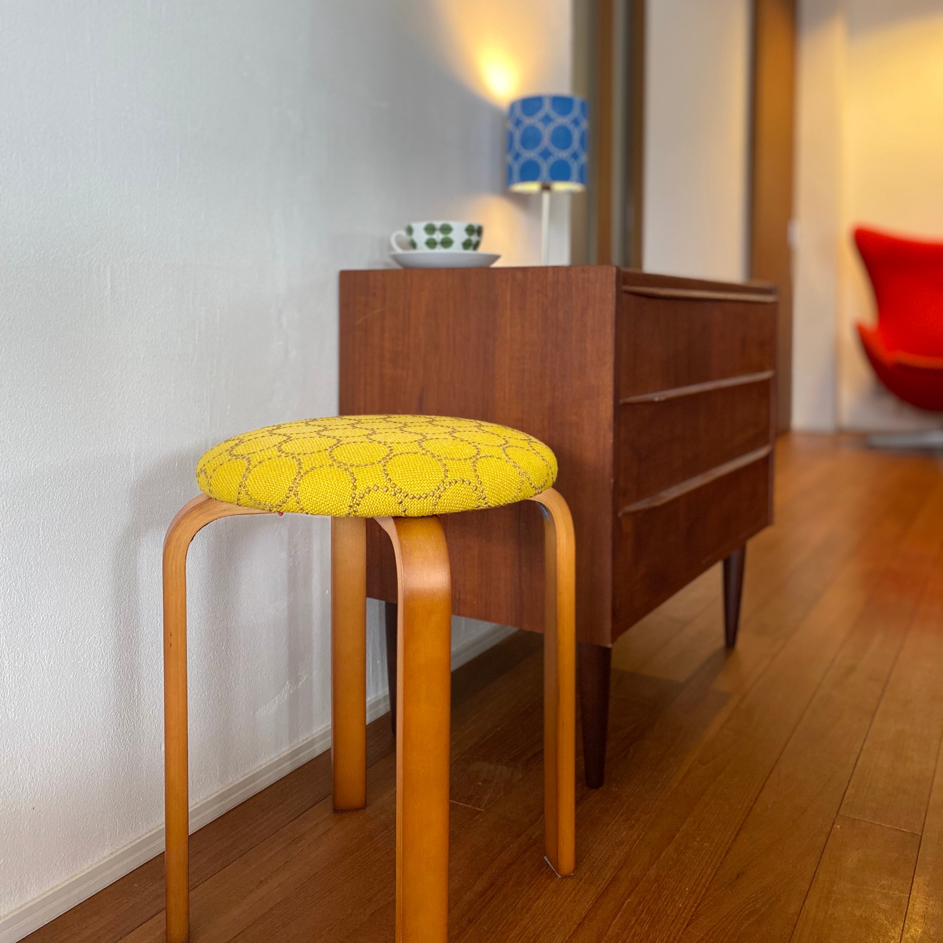 皆川明氏とデンマーク・クヴァドラ社のコラボによる生地、タンバリンハリンダルを使用したスツールです。